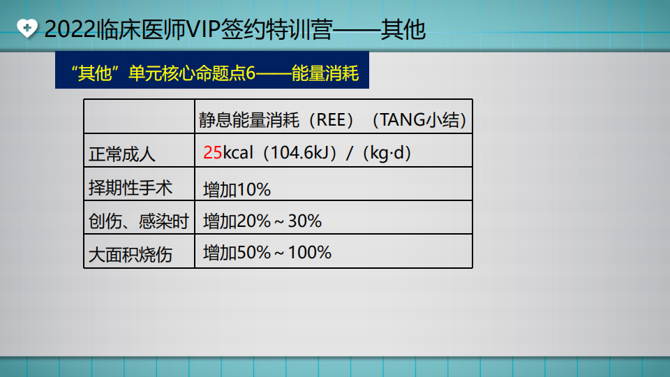 临床医师“其他”单元核心命题点——能量消耗(汤以恒总结)如下,汤以恒老师4月25日开展了VIP强化特训公开课,参与直播的同学热情高涨,都是干货,全是精髓! 错过直播的同学可以看直播回放>>,现在将精彩讲义内容摘取如下,没有参加直播的同学,也可以一睹为快啦!
