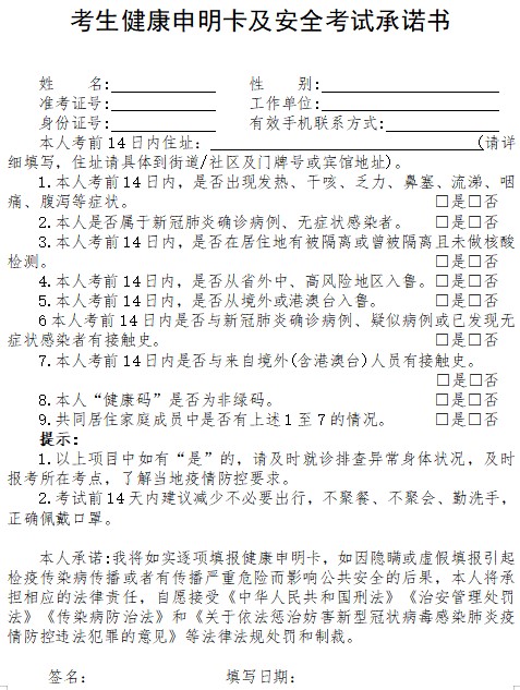 山东考区2022年医师资格考试实践技能考生健康申明卡及安全考试承诺书如下,医学教育网编辑为您整理。