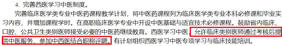 完善临床医学类专业中医药课程教学计划,将中医药课程列为临床医学类专业本科必修课和毕业实习内容,并增加课程学时。在高职临床医学专业中开设中医基础与适宜技术必修课程。鼓励省内临床、口腔、公共卫生类别医师接受必要的中医药继续教育。西医学习中医,允许临床类别医师通过考核后提供中医服务,参加中西医结合职称评聘。有计划组织西医学习中医专项学习与临床技能培训。