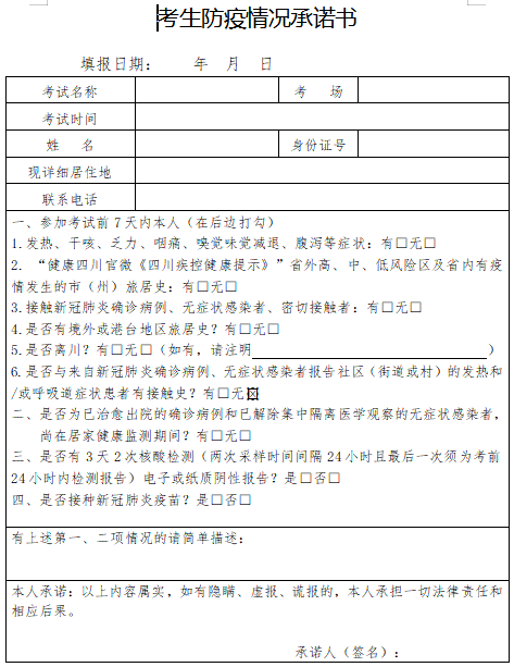 根据四川泸州考点发布的通知,考生需签订考前疫情防控承诺书。考生必须签订考前疫情防控承诺书,对旅居史等疫情防控要求自我承诺,并将签订的承诺书带到考场,故意隐瞒造成疫情传播,依法承担相关法律责任。医学教育网老师为大家整理总结如下,希望可以帮助到各位:
