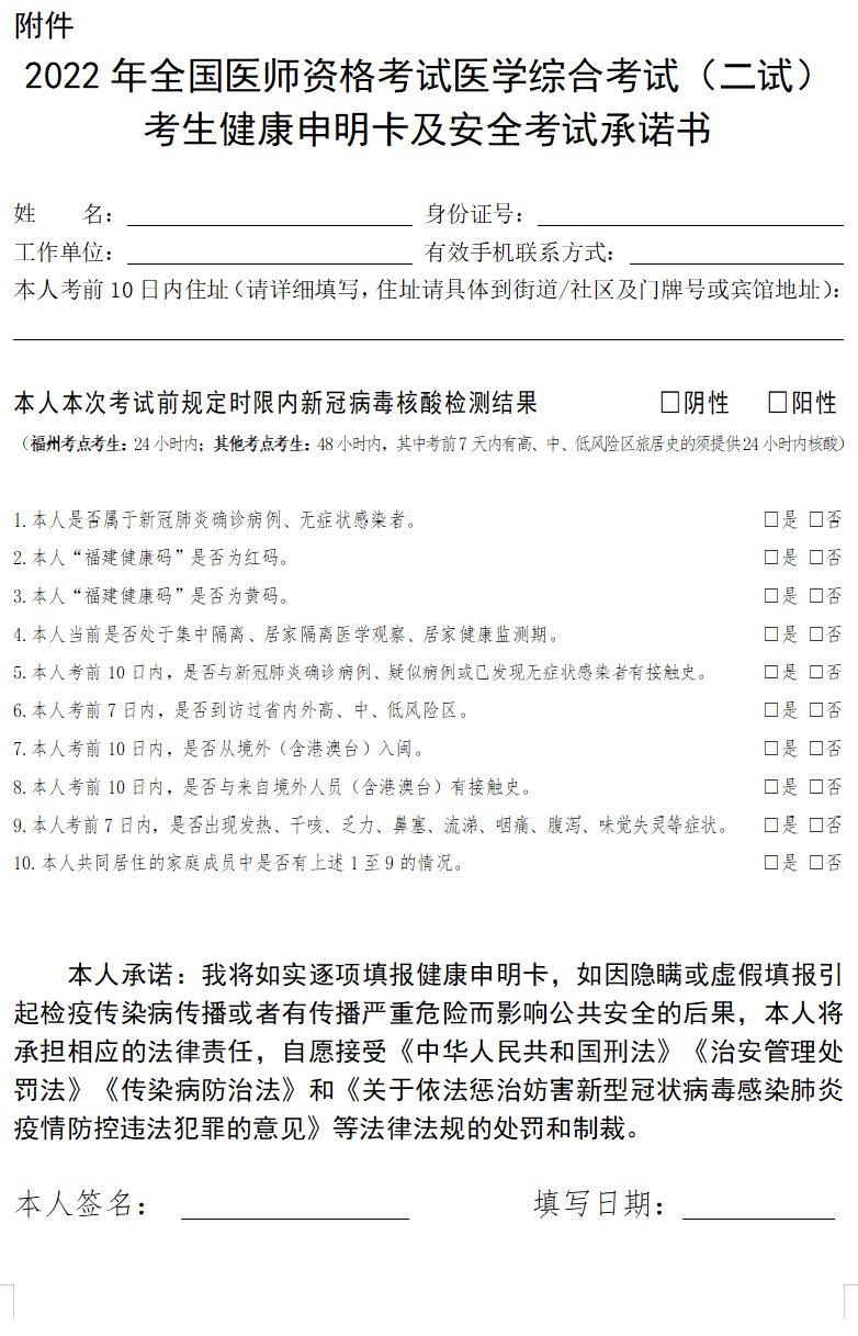 【附件下载】2022年全国医师资格考试医学综合考试(二试)考生健康申明卡及安全考试承诺书