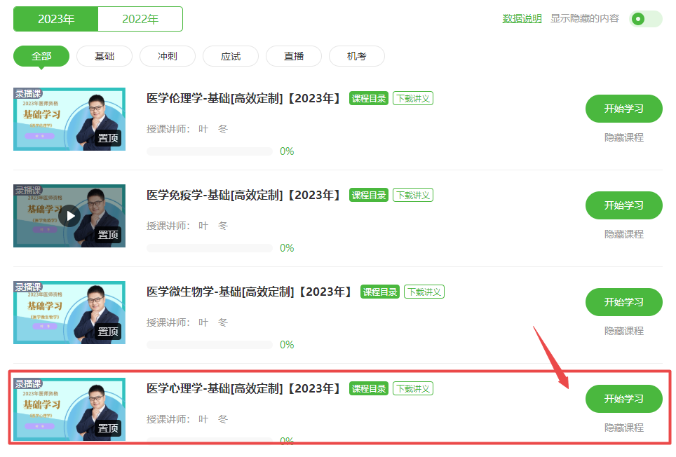 2023年医师备考全面开启!2023年临床执业医师基础学习新课开通!目前由叶冬老师授课的《医学心理学》科目课程已更新!已购课同学可以直接进入我的网校我的家-我的课程-医学心理学科目进行学习!关于2023年临床执业医师《医学心理学》考试大纲/教材变动的相关内容,具体内容下方查看。未购课学员点击此处进入选择课程>>,具体看课位置如下: