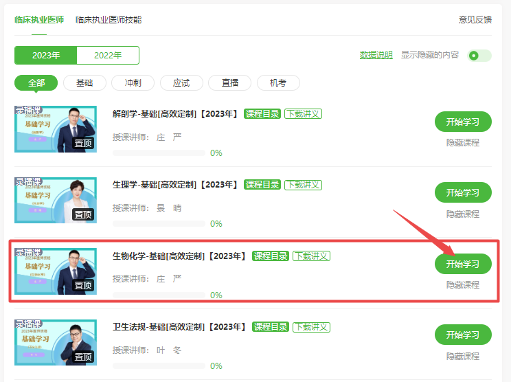 2023年医师备考全面开启!2023年临床执业医师基础学习新课开通!目前由庄严老师授课的《生物化学》科目课程已更新!已购课同学可以直接进入我的网校我的家-我的课程-生物化学科目进行学习!关于2023年临床执业医师《生物化学》考试大纲/教材变动的相关内容,具体内容下方查看。未购课学员点击此处进入选择课程>>,具体看课位置如下: