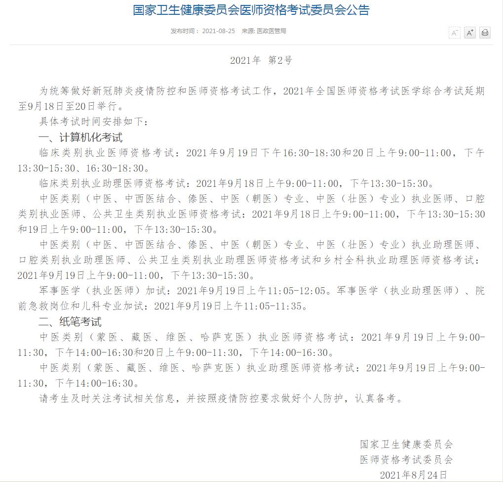 官宣!2021年临床执业医师综合考试时间公布(9月19-20日)!
