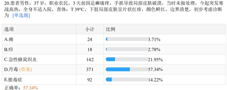 以上就是医学教育网关于“临床医师高频考点“丹毒”基础模考测评正确率57.34%”的相关介绍,希望能够帮助到大家,更多资讯尽在医学教育网临床执业医师栏目!