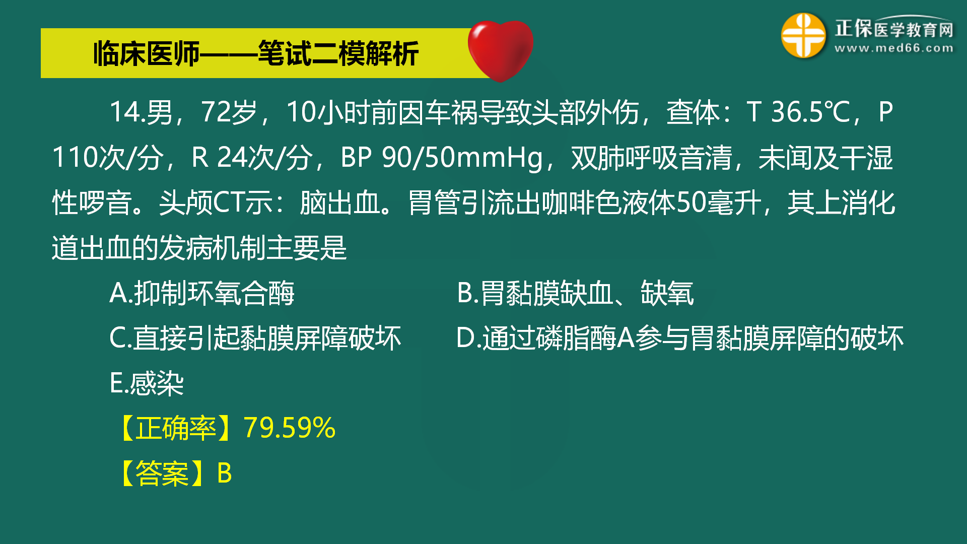 14.男,72岁,10小时前因车祸导致头部外伤,查体:T 36.5℃,P 110次/分,R 24次/分,BP 90/50mmHg,双肺呼吸音清,未闻及干湿性啰音。头颅CT示:脑出血。胃管引流出咖啡色液体50毫升,其上消化道出血的发病机制主要是 A.抑制环氧合酶B.胃黏膜缺血、缺氧 C.直接引起黏膜屏障破坏D.通过磷脂酶A参与胃黏膜屏障的破坏 E.感染 【正确率】79.59%【答案】B关于答案解析,考点回顾及关联考点讲解,可点击查看回放视频>>还未参加模考?点击下方图片,立即参与免费测评>>