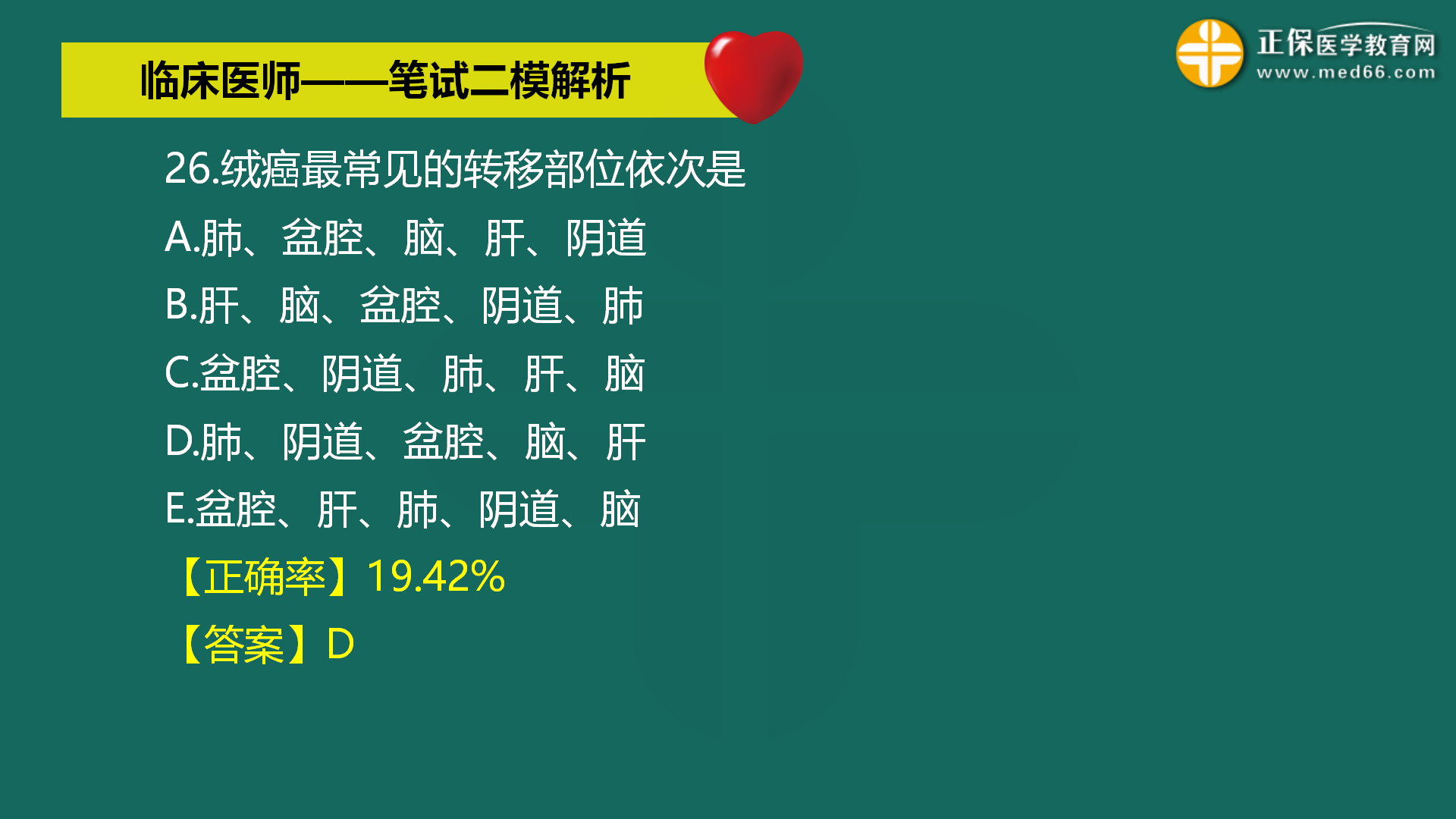以上就是医学教育网关于“【正确率19.42%】绒癌最常见的转移部位依次是:肺、阴道、盆腔、脑、肝”的相关介绍,希望能够帮助到大家,更多资讯尽在医学教育网!