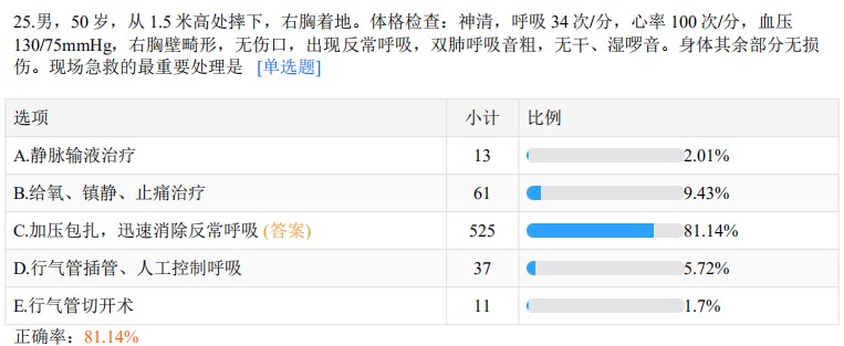 以上就是医学教育网关于“多根多处肋骨骨折——全国临床执业医师模考正确率81.14%”的相关介绍,希望能够帮助到大家,更多资讯尽在医学教育网临床执业医师栏目!