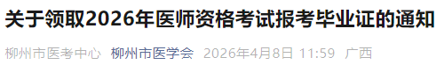 2026年4月13日起柳州市考点的考生可以领取2026年医师资格考试报考时所提交的毕业证,现就领取证书的具体事宜通知如下: