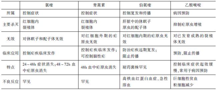 重点掌握杀灭疟原虫的配子体、裂殖体的适用药物,对控制复发、预防、传播的适用药物也要明确。