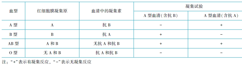 1.ABO血型系统 在ABO血型系统中,红细胞膜上含有两种不同的抗原,分别称为A抗原和B抗原(凝集原)。在人类血清中含有与其相对应的两种抗体,即抗A抗体和抗B抗体。根据红细胞膜上所含ABO血型系统抗原的不同种类,将人类血液分为四型:凡红细胞膜上只含A抗原者为A型;只含B抗原者为B型;含有A、B两种抗原者为AB型;既不含A抗原也不含B抗原者为O型。在同一个体血清中不含有与其自身红细胞发生反应的血型抗体(凝集素)。即在A型血的血清中,只含有抗B凝集素;B型血的血清中,只含有抗A凝集素;AB型血的血清中没有抗A和抗B凝集素,而O型血的血清中则含有抗A和抗B凝集素。相关要点总结如下: