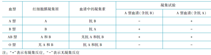 1.ABO血型系统 在ABO血型系统中,红细胞膜上含有两种不同的抗原,分别称为A抗原和B抗原(凝集原)。在人类血清中含有与其相对应的两种抗体,即抗A抗体和抗B抗体。根据红细胞膜上所含ABO血型系统抗原的不同种类,将人类血液分为四型:凡红细胞膜上只含A抗原者为A型;只含B抗原者为B型;含有A、B两种抗原者为AB型;既不含A抗原也不含B抗原者为O型。在同一个体血清中不含有与其自身红细胞发生反应的血型抗体(凝集素)。即在A型血的血清中,只含有抗B凝集素;B型血的血清中,只含有抗A凝集素;AB型血的血清中没有抗A和抗B凝集素,而O型血的血清中则含有抗A和抗B凝集素。相关要点总结如下: