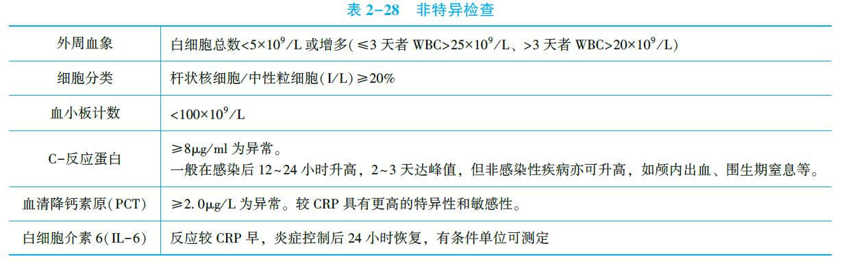 所谓非特异检查指的是敏感性高而特异性差,即新生儿败血症时可出现以下指标异常,但仅凭以下指标异常不能确诊新生儿败血症。
