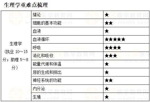 生理学约占7分左右,很多学员都觉得这门课很难,所谓“半斤对八两”,谁比谁都不强,首先从心理上接受“有点难”的事实;其次“打蛇七寸,擒贼擒王”,重点单元是血液循环、呼吸,大家一定要集中火力重点突破;最后“学练结合”,用做题代替死记硬背、用做题检验复习效果、用做题训练解题技巧,这样的复习备考才是接地气的。