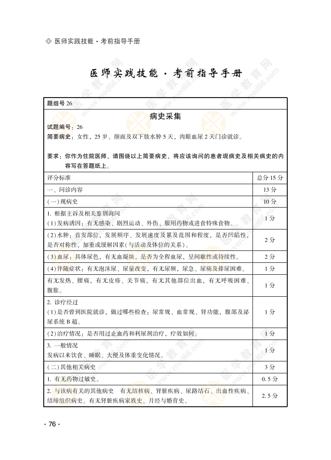 【病史采集26号习题】女性,25岁。颜面及双下肢水肿5天,肉眼血尿2天门诊就诊!具体内容医学教育网编辑整理分享如下,希望对正在备战2022年医师实践技能考试的考生有所帮助!