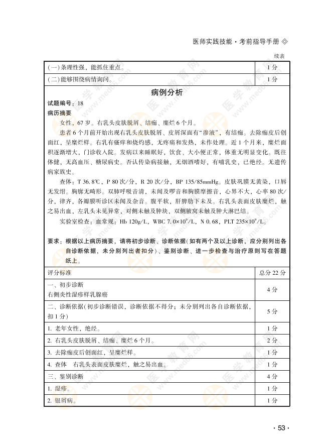 女性,67岁。右乳头皮肤脱屑、结痂、糜烂6个月-临床病例分析18号习题!具体内容医学教育网编辑整理分享如下,希望对正在备战2022年医师实践技能考试的考生有所帮助!