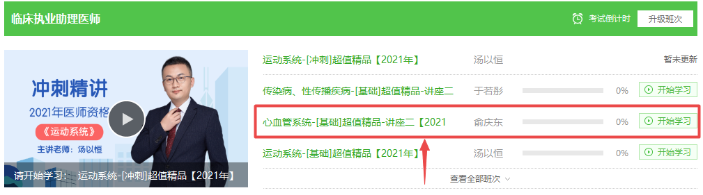 2021年临床助理医师考试俞庆东《心血管系统》基础学习班讲座二新课更新啦!已购课同学可以直接进入我的网校我的家-我的课程-心血管系统-讲座二进行学习!2021年临床助理心血管系统考试大纲无变动,2021年新教材有部分变动。具体内容下方查看。未购课学员点击此处进入选择,具体看课位置如下:
