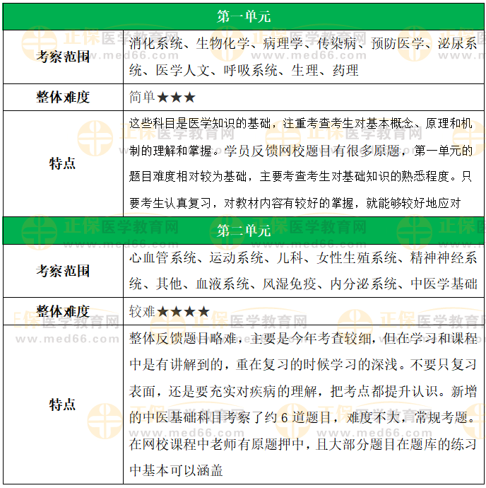 2.与2024年相比,各单元考试科目范围基本保持一致:第一单元继续以基础医学、预防医学、医学人文等记忆类题目为主,第二单元主要考察临床医学与中医基础部分。需注意的是,单元间科目划分并非绝对,存在交叉情况,例如消化、泌尿、传染病等临床科目内容,也会少量出现在第一单元中。此外,今年中医题目难度依然不高,据考生反馈考查6道,基本各章节覆盖1道,均为常见考点。