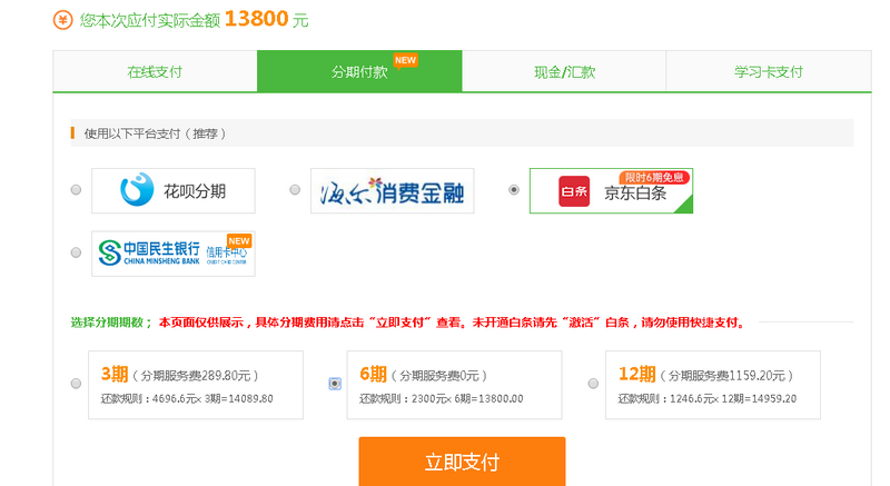 注意事项:只有6期分期购买服务费为0元,其他期数暂时没有优惠。