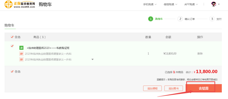 第二步:在购物车内确认已选课程,确认无误后点击“去结算”;