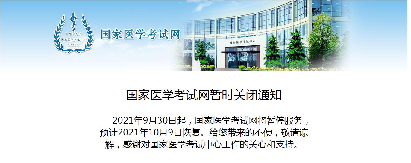 2021年9月30日起,国家医学考试网将暂停服务,预计2021年10月9日恢复。给您带来的不便,敬请谅解,感谢对国家医学考试中心工作的关心和支持。