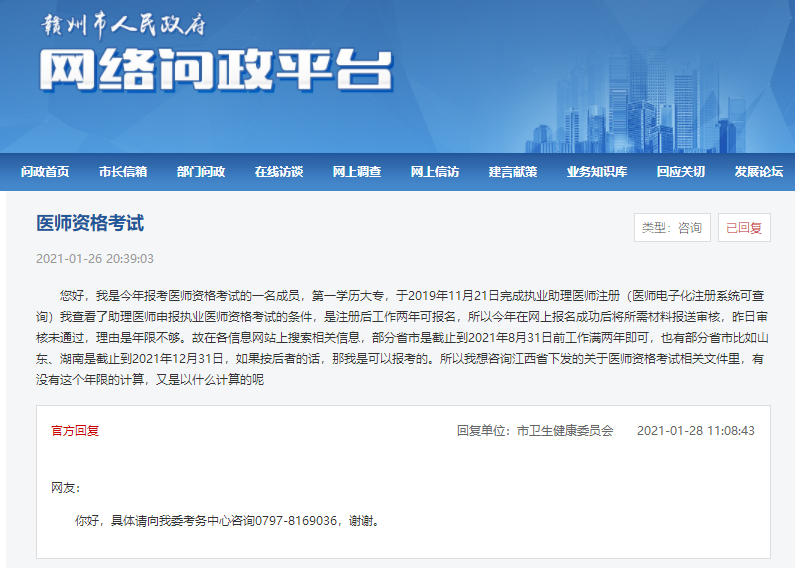 提问:您好,我是今年报考医师资格考试的一名成员,第一学历大专,于2019年11月21日完成执业助理医师注册(医师电子化注册系统可查询)我查看了助理医师申报执业医师资格考试的条件,是注册后工作两年可报名,所以今年在网上报名成功后将所需材料报送审核,昨日审核未通过,理由是年限不够。故在各信息网站上搜索相关信息,部分省市是截止到2021年8月31日前工作满两年即可,也有部分省市比如山东、湖南是截止到2021年12月31日,如果按后者的话,那我是可以报考的。所以我想咨询江西省下发的关于医师资格考试相关文件里,有没有这个年限的计算,又是以什么计算的呢