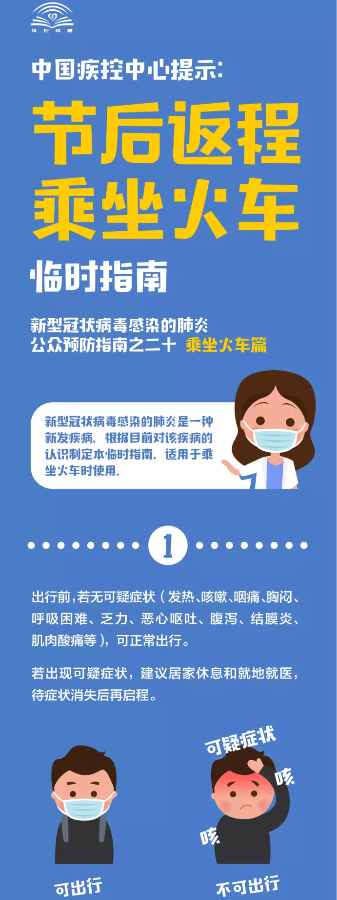 现在正值疫情发展的关键时期,但是为了生活,相信很多返程务工人员已经准备或者开始踏上归程,中国疾控中心提出了疫情期间预防指南之如何乘火车,一定要牢记以下几点: