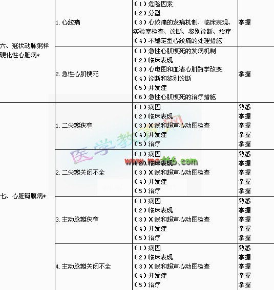 | 3.肥厚型心肌病 | (1)临床表现 (2)X线、心电图和超声心动图检查 (3)诊断和鉴别诊断 (4)治疗措施 | 掌握 | |