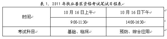 2011年执业兽医资格考试时间为10月16日。上午举行基础、临床两个科目笔试;下午举行预防、综合应用两个科目笔试,上、下午考试时间各150分钟,考试时间共计5个小时