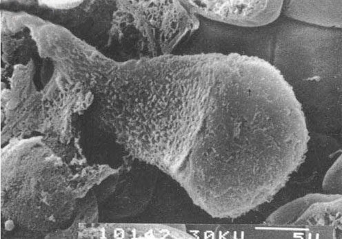 图中央部系一正在脱落到管腔的上皮细胞。其游离面的细膜上有散在的小球状突起(↑)。细胞侧面不平,接近游离面的部分有横行的微褶,中间及基底部有大小不一形态不定的突起。