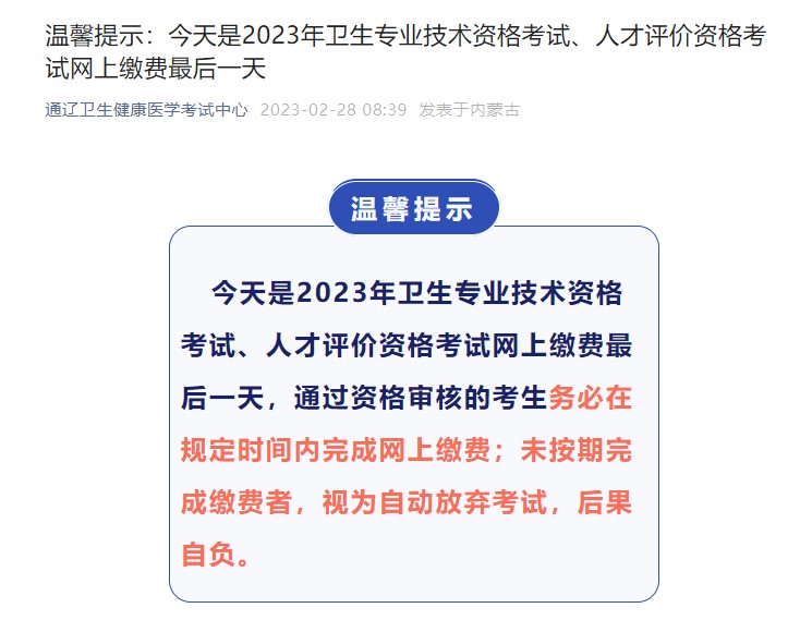 通辽卫生健康医学考试中心发布2023年卫生专业技术资格考试网上缴费温馨提示,具体内容如下: