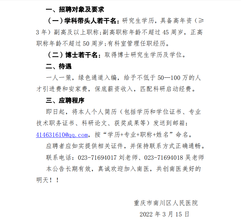 为满足医疗卫生事业发展需要,按照公开、平等、竞争、择优原则,“重庆市南川区人民医院2022年招聘学科带头人、博士若干名”的公告正式发布啦!关注着医疗招聘的小伙伴,一定不要错过呀!事不宜迟,接下来就和小编一起来看看具体岗位和招聘相关事宜吧~