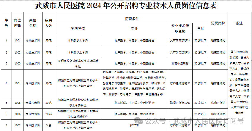 详见《武威市人民医院2024年公开招聘专业技术人员岗位信息表》