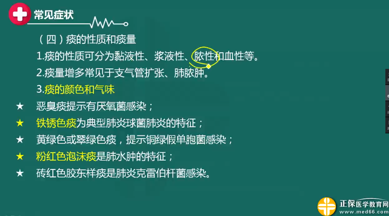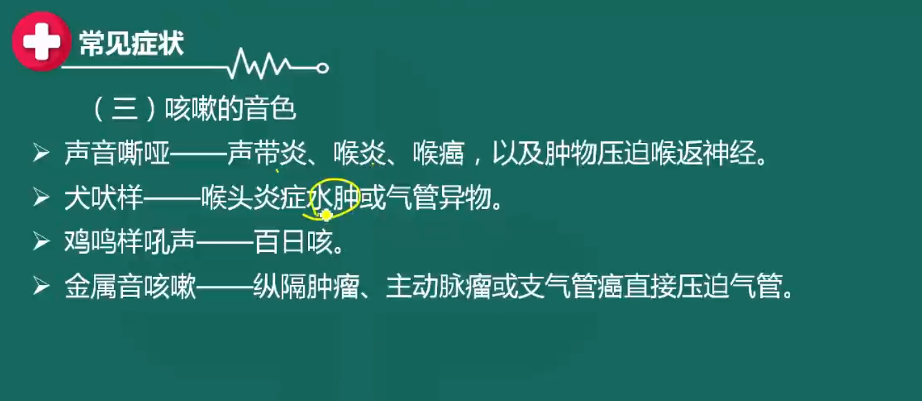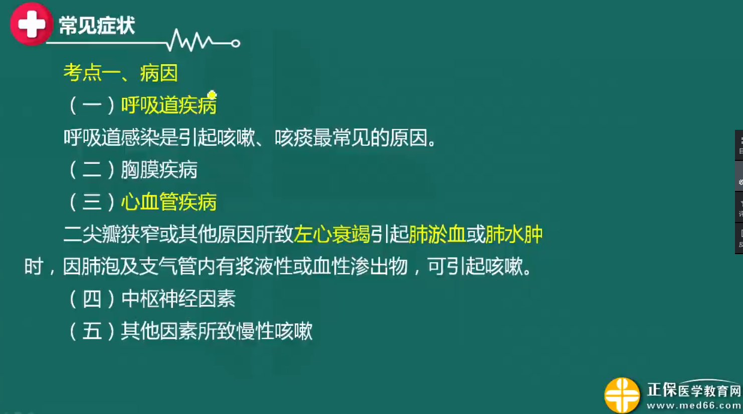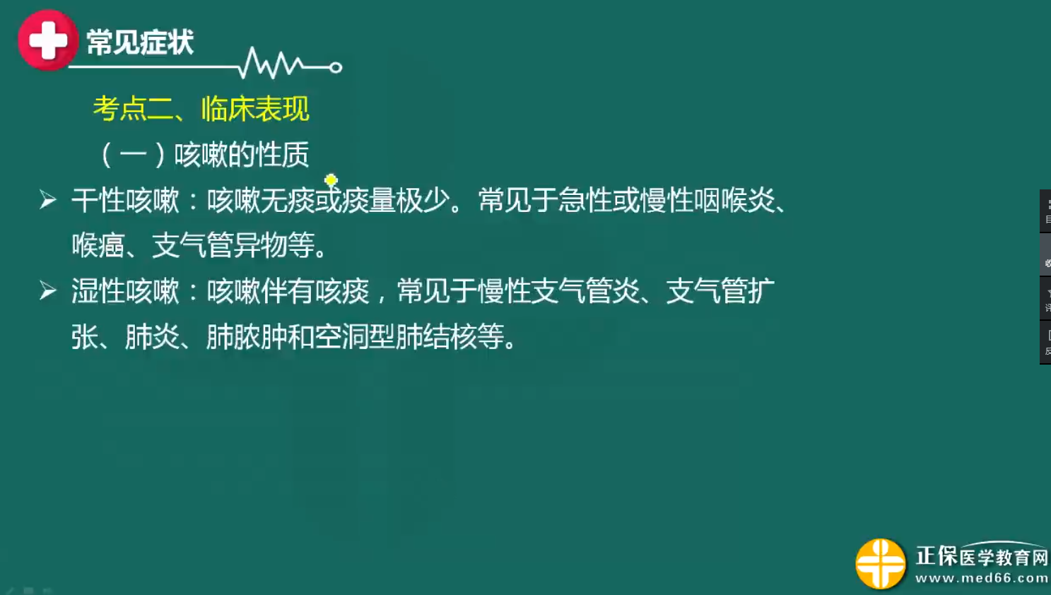 “咳嗽与咳痰”是医疗卫生招聘临床专业课-诊断学的重要考点之一,那么大家对“临床诊断学基础:咳嗽与咳痰的病因及临床表现(附含例题)”都了解吗?今天医学教育网小编就为大家整理了医学教育网医疗卫生招聘--临床专业课的免费试听内容,快来看看吧!