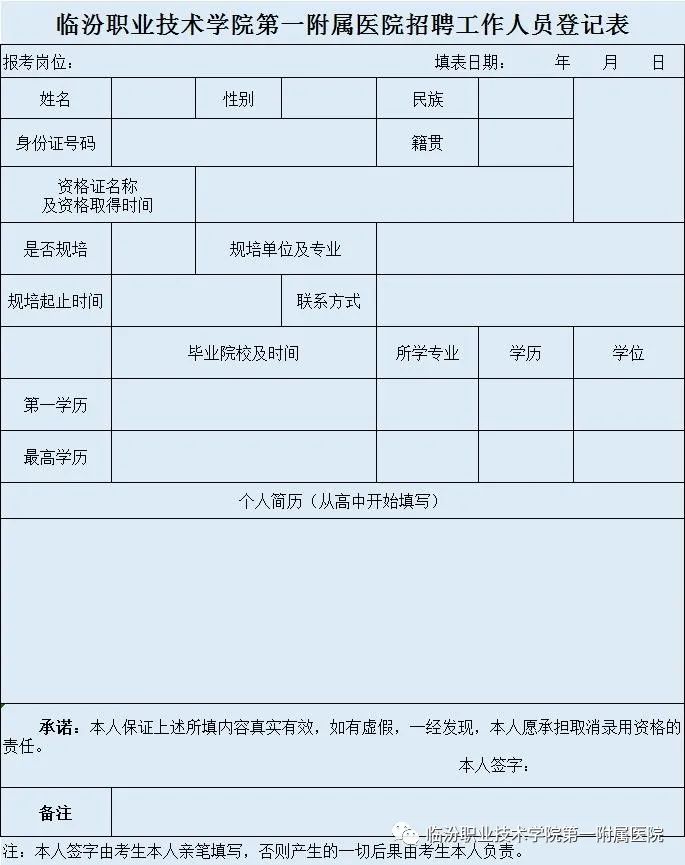 附:临汾职业技术学院第一附属医院招聘工作人员登记表