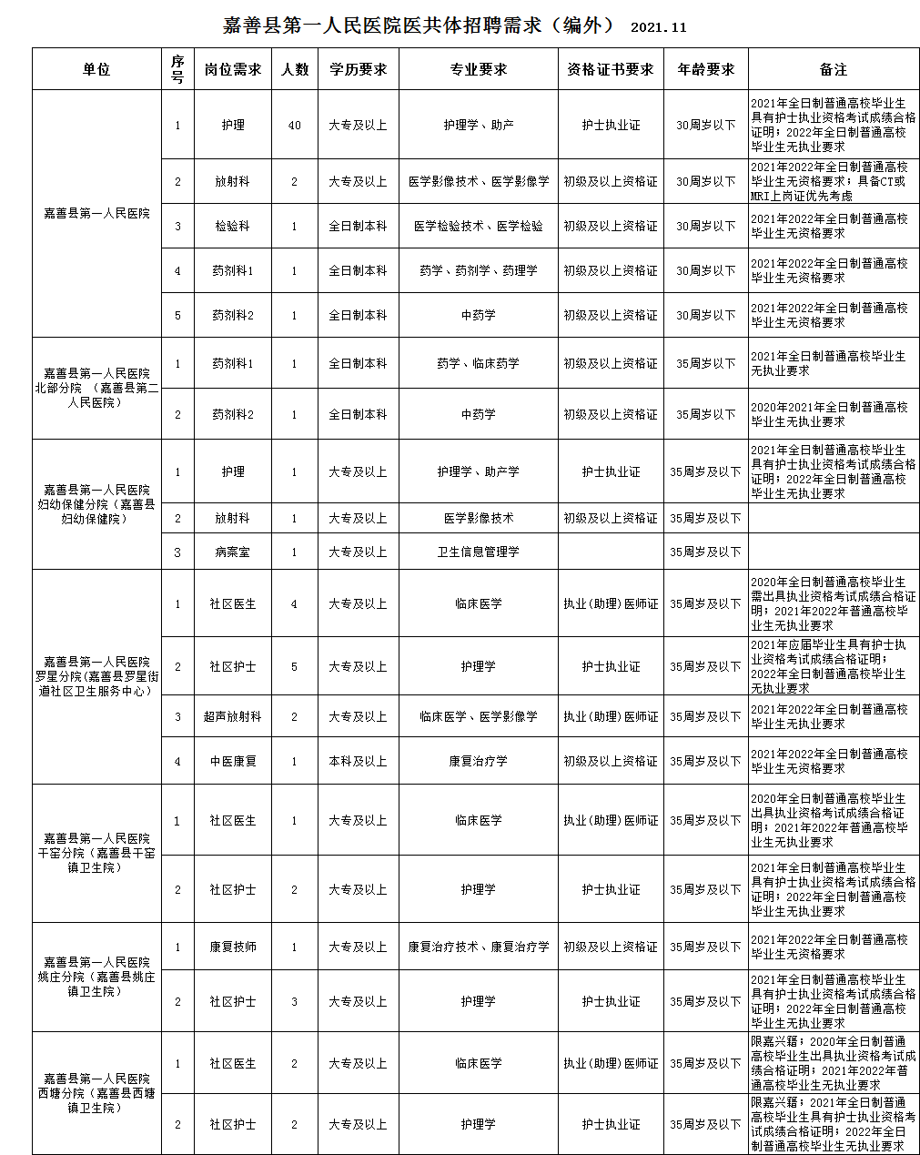 很多即将步入医疗岗位的朋友们都非常关注所在地区医疗岗位的招聘公告信息,医学教育网医疗卫生招聘栏目为了更好的服务正在找工作的医疗相关专业人员,每天为大家整理搜集新鲜的各地医疗卫生系统/医院等招聘公告通知和信息,欢迎大家查看!以下是公告通知:嘉兴市嘉善县第一人民医院医共体招聘编外合同制工作人员73名,内容如下: