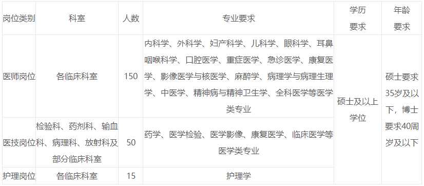 2022年计划公开招聘215人,其中:医疗岗150人,医技岗50人,护理岗15人。