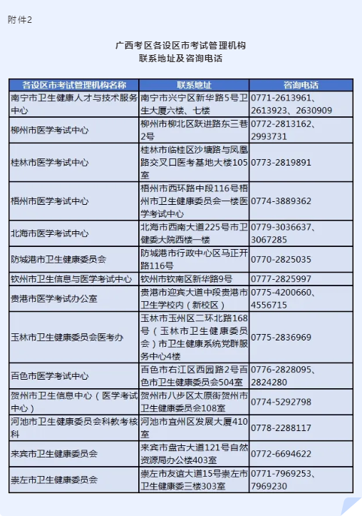 广西考区各设区市考试管理机构联系地址及咨询电话见附件2(各考生前往现场确认前请务必与所在设区市考试管理机构联系)。