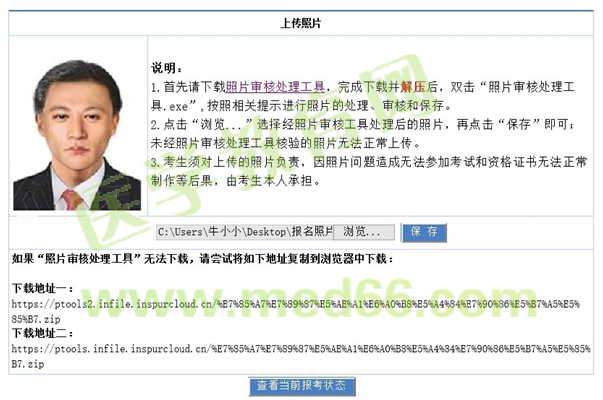 基本信息填写并保存后,须进行照片上传。为确保签到表、准考证、资格证书等文件照片正常显示,考生须首先下载【照片审核处理工具】,未经照片审核工具核验的照片无法正常上传。具体操作见下图: