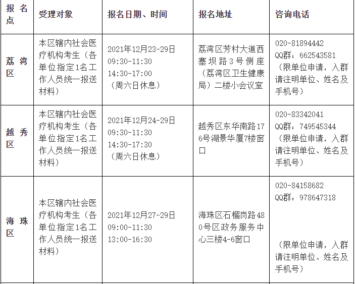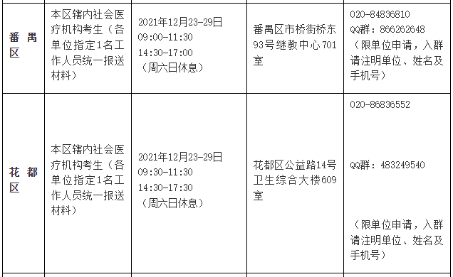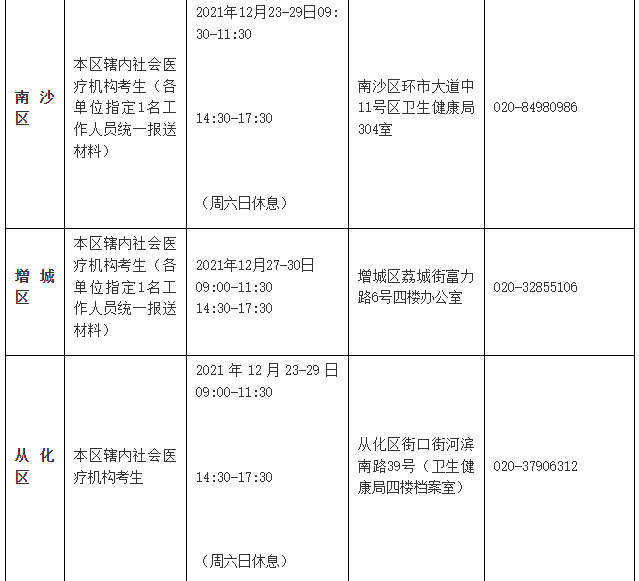 (2)各区卫健局分别设立报名点,受理本区卫健局直属单位(或区直属单位)及辖区内社会医疗机构的报名确认,受理本区卫健局直属单位(或区直属单位)的确认时间和地点由各区根据实际情况自行确定,于2021年12月21-31日期间完成现场确认工作;受理社会医疗机构的报名确认时间及地点,具体安排如下:
