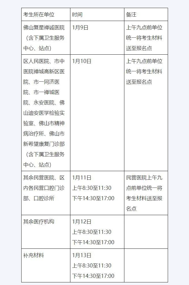5.三水区报名点:受理在三水区医疗机构(含民营)工作的考生报名,地址:佛山市三水区西南街道涌南路5号区健康教育与促进中心1楼,联系电话:0757-87733334。现场确认时间安排如下:1月6日,9日,三水区各医院、社区卫生服务中心(站);1月10-11日,三水区各诊所、门诊部、医务室、养老机构及其他单位;1月12日,三水区考生最后修改资料、补充材料日期。