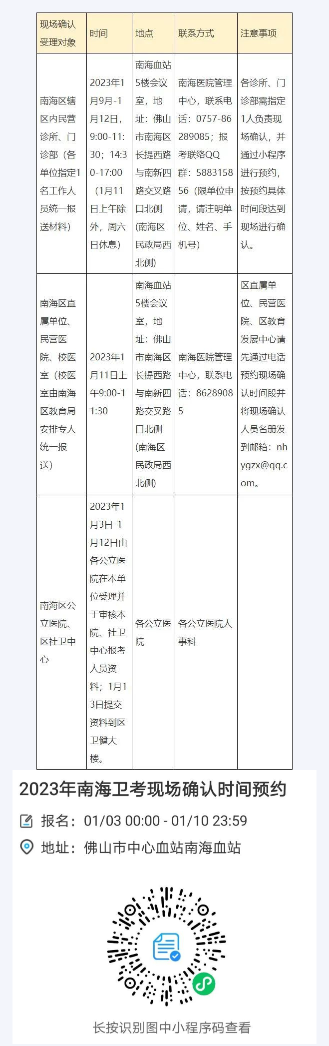 3.南海区报名点:受理在南海区医疗机构(含民营)工作的考生报名,联系电话:0757-86289085,现场确认时间地点如下;