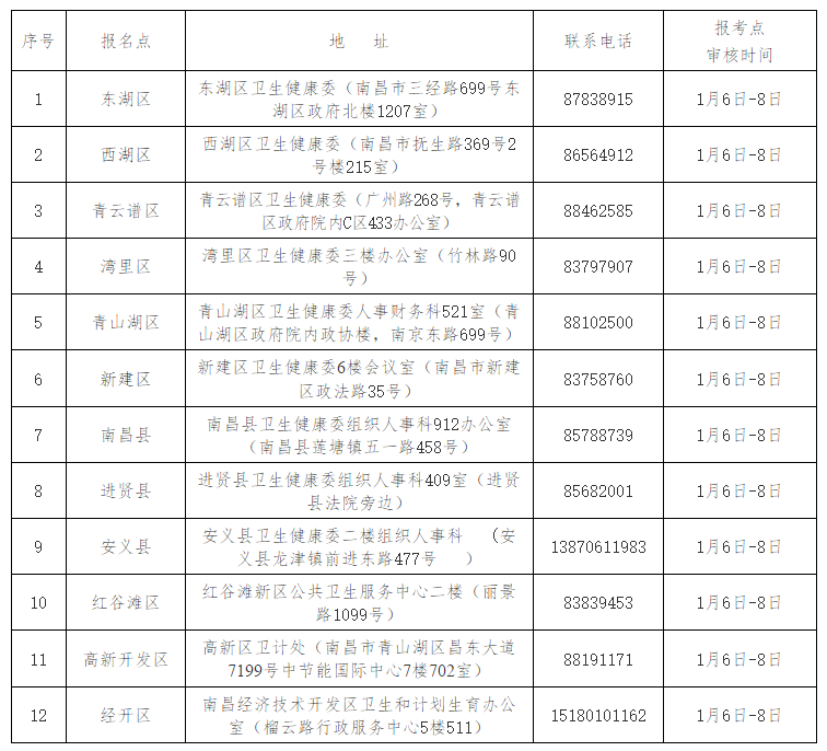 南昌市辖区各报名点卫生专业技术资格考试现场确认安排
