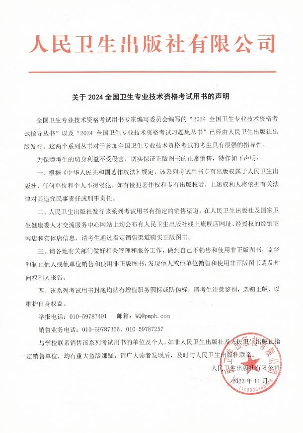 国家卫生健康委人才交流服务中心发布关于全国2024年卫生专业技术资格考试用书的声明,医学教育网为大家整理如下: