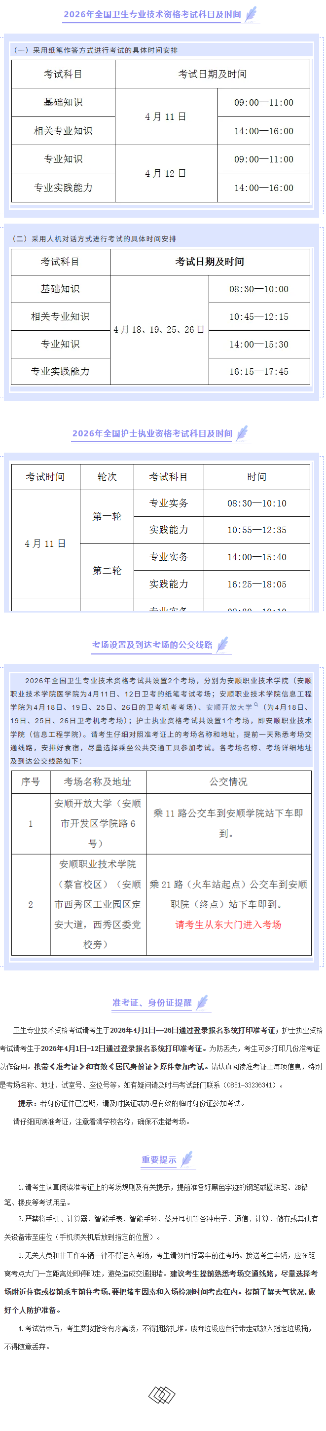 2026年全国卫生专业技术资格考试和护士执业资格考试安顺考点考前温馨提示