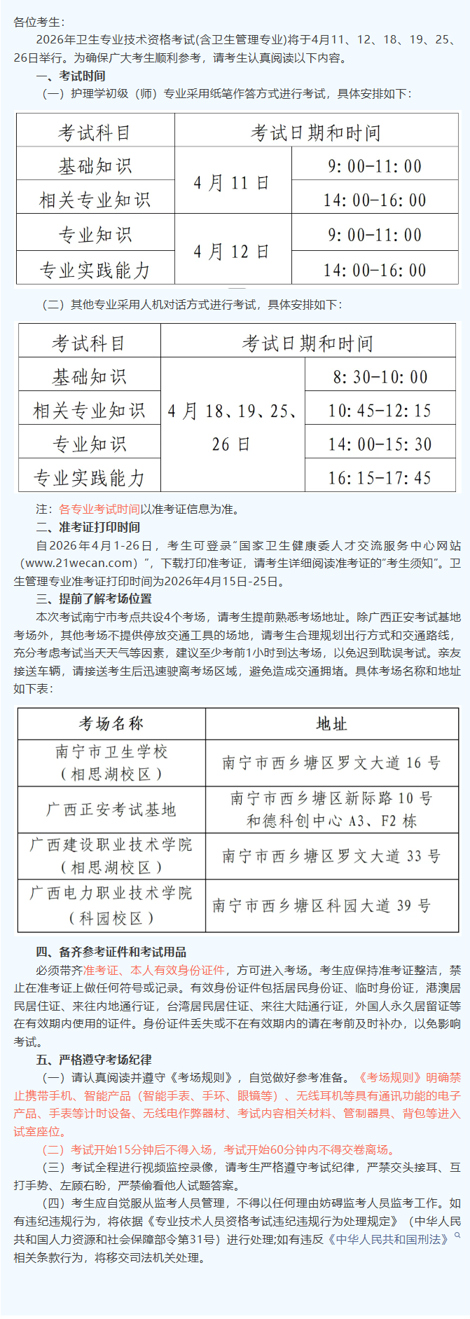 南宁市考点2026年卫生专业技术资格考试考前温馨提示
