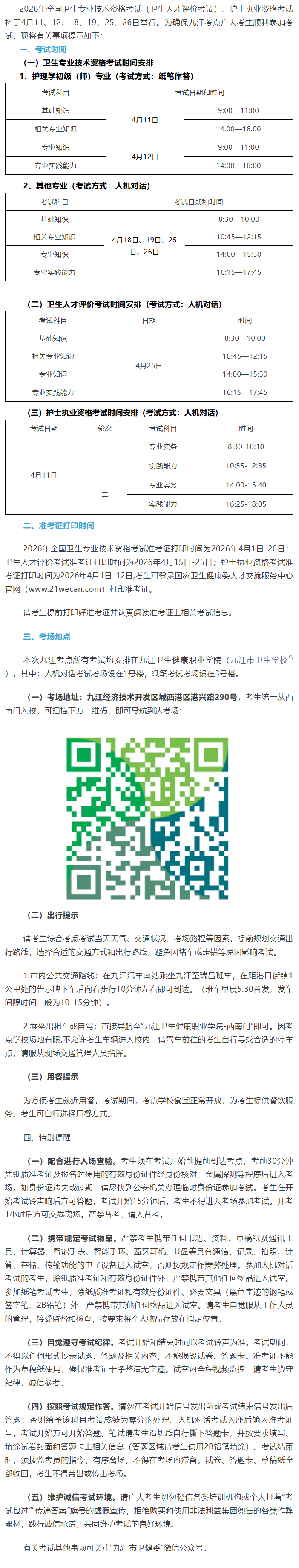 2026年度全国卫生专业技术资格考试(卫生人才评价考试)、护士执业资格考试九江考点温馨提示