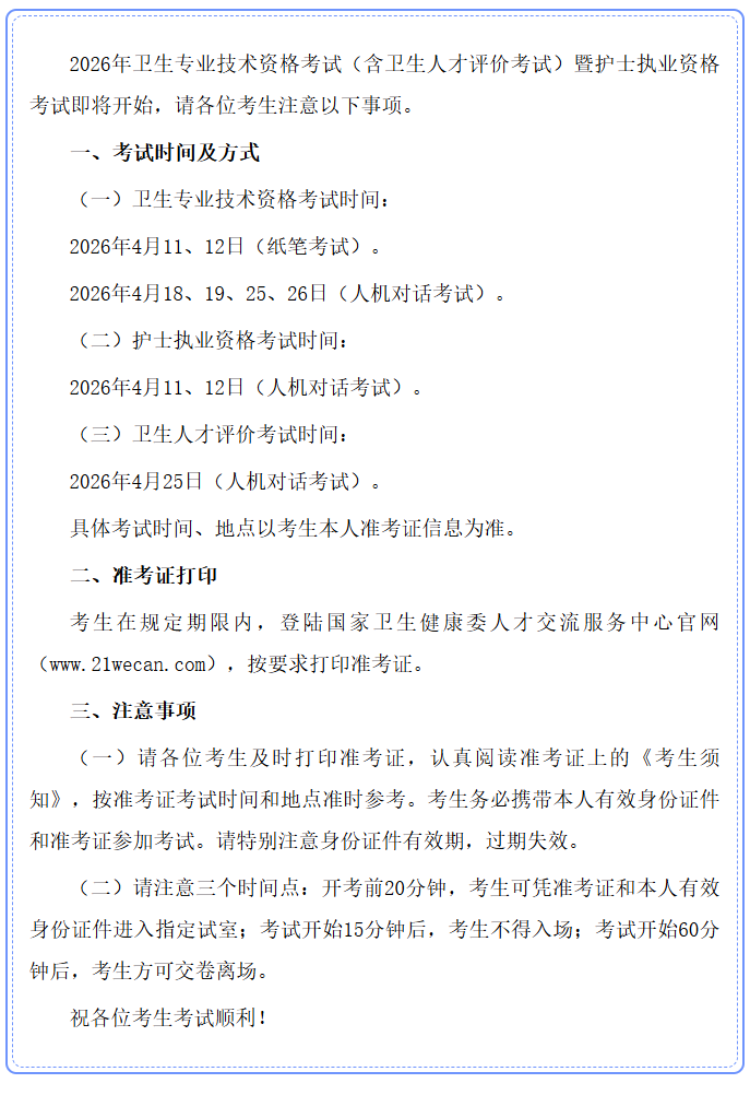 2026年卫生专业技术资格考试(含卫生人才评价考试)暨护士执业资格考试四川考区温馨提示