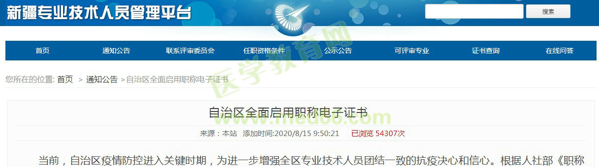 各位新疆的考生注意啦!根据新疆官方通知,新疆地区全面启用职称电子证书!医学教育网为大家带来详细内容如下:
