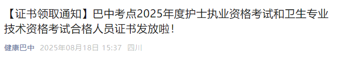 2025年度全国护士执业资格考试暨卫生专业技术资格考试巴中考点合格人员证书(不含基层卫生中级)已送达各县(区)卫生健康局,请大家尽快前往领取。